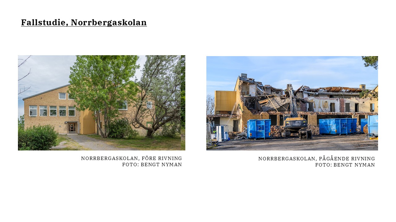 Björn Johansson, White arkitekter, presenterade en rapport om ekonomiska drivkrafter bakom rivning av fungerande skolor. I rapporten har man studerat fall av rivna skolor i Göteborg (Lundby gymnasium) och Vaxholm (Norrbergaskolan), analyserat beslutsprocesser och ekonomiska motiv samt gjort litteraturstudier och intervjuer.